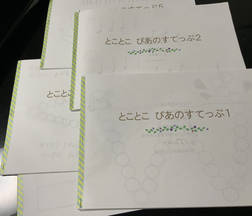 「五線」譜上で「これがド」だよ」「レだよ」と伝える前に、ピアノから出るたくさんの素敵な音色に、表現に触れてほしい!五線に出会ったときに「ドレミ」以外の情報も自然と目に入るよう仕向けて行きたい!そんな思いから、オリジナルテキスト「とことこぴあのすてっぷ」が生まれました。